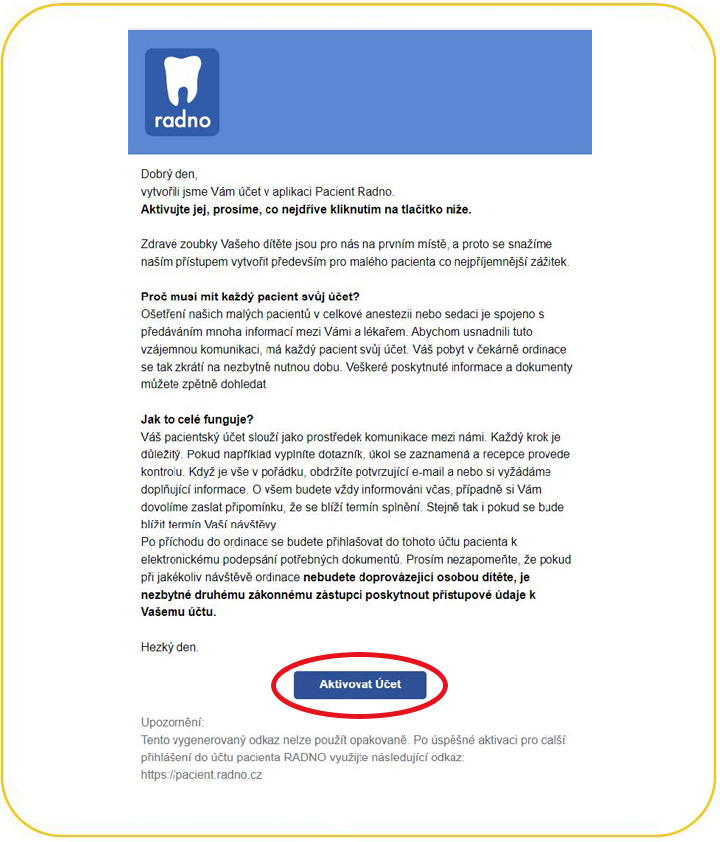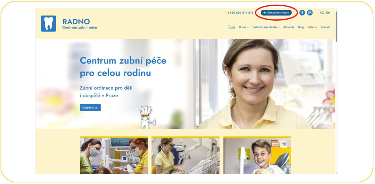 Pokud musíte další vyplňování údajů v pacientském účtu přerušit, pro příští přihlášení klikněte v komunikačním e-mailu na link pro přihlášení do účtu pacienta nebo na webové stránce www.radno.cz na tlačítko vpravo nahoře „Účet pacienta Radno“.